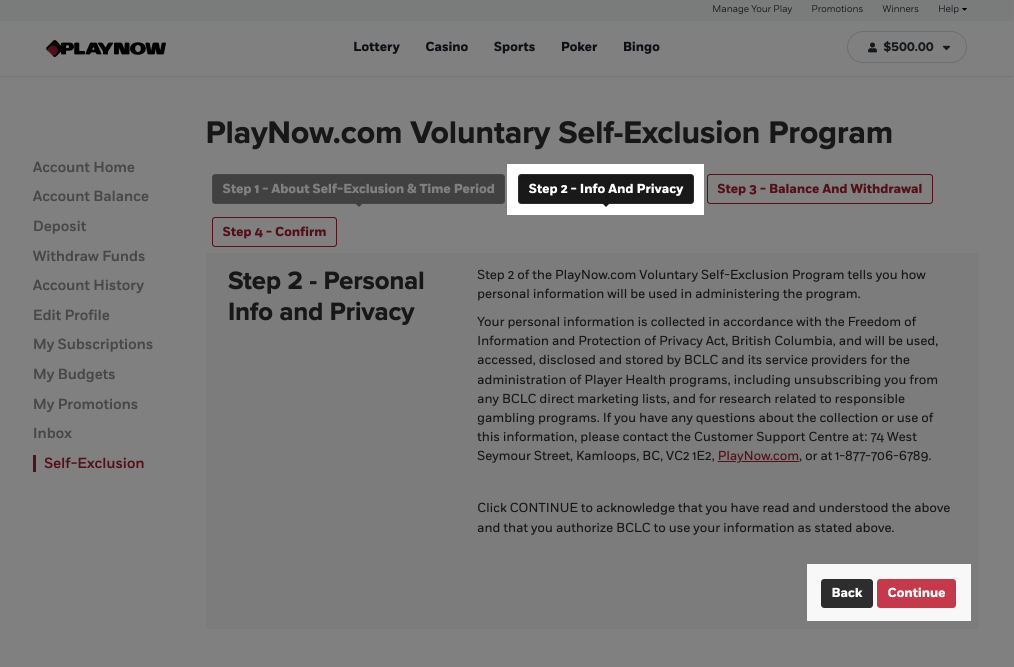 For more information on your existing voluntary self-exclusion contact our Security Programs office at 204-957-2500 ext. 8468.